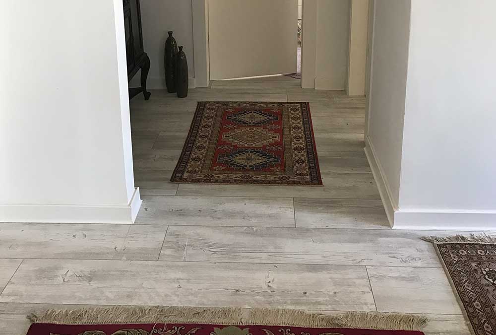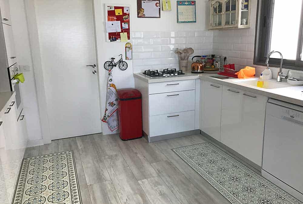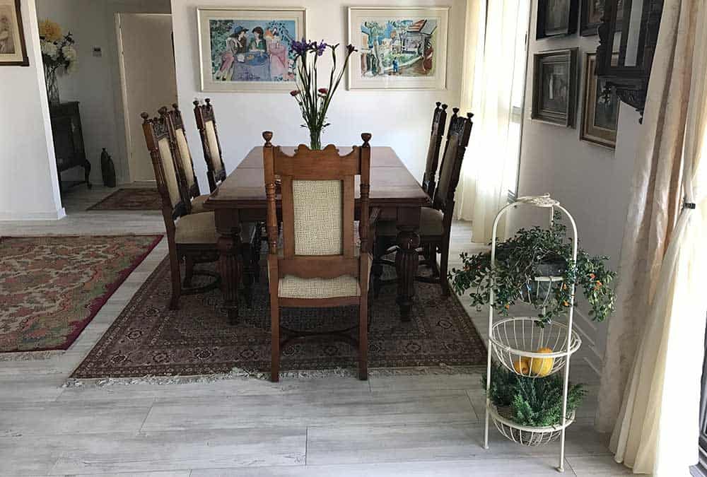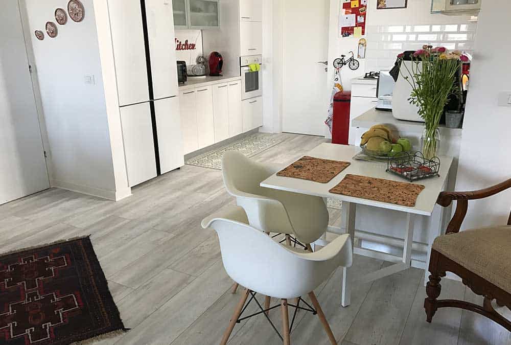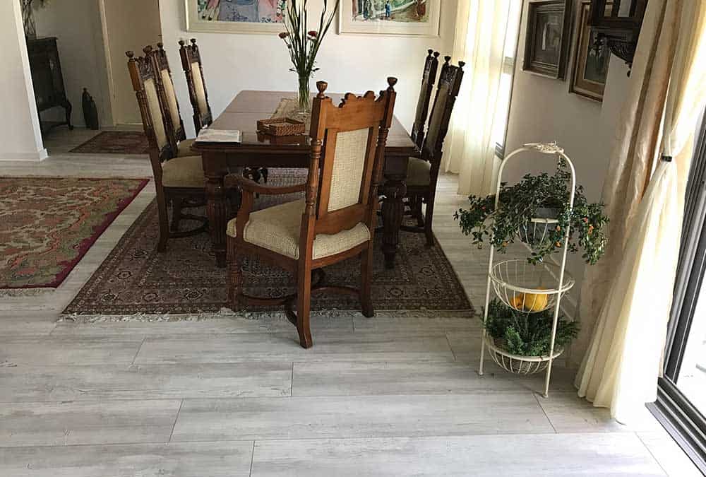 בדירה חדשה בהוד השרון, הותאם פרקט בגווני לבן ואפור. הפרקט מצליח להאיר את הריהוט העתיק והכהה, מחמיא לשטיחים הצבעוניים ומשתלב היטב עם גוון האלומיניום האפור כהה בדירה. מכיוון שהדירה משופעת בפרטי ריהוט ייחודיים, הפרקט מעניק לעין תחושה של מרחב ושקט.